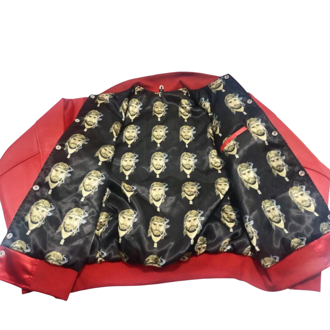 Take your varsity style to the next level with this satin varsity jacket, finished with a plush liner covered in the Jesus Smokes logo. The outside features a clean embroidered chest patch, while the inside makes a bold statement with an all-over print. Built for comfort and standout style, this jacket blends classic varsity heritage with signature details.