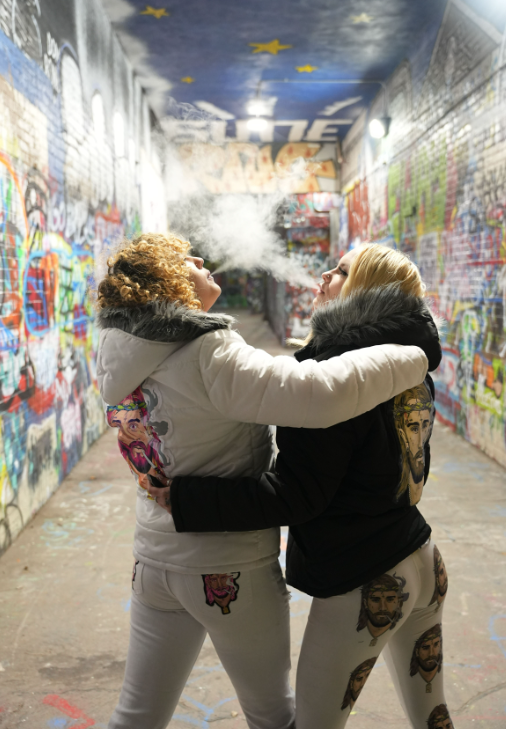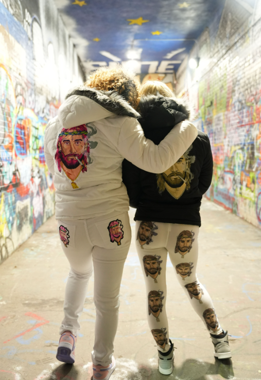 White Bubble coat lined with white fur branded with Jesus Smokes white liner, pink logo