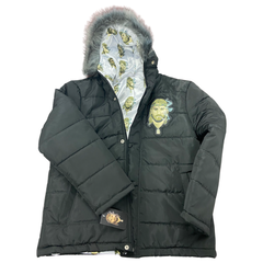 Black Bubble coat lined hood with grey fur. Branded with white liner and Jesus Smokes original logo