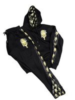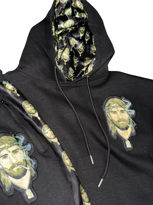 Jogger with satin liner in the hood and accents down the Jogger. leg flares with liner inside zipper. Branded with Jesus Smokes logo.