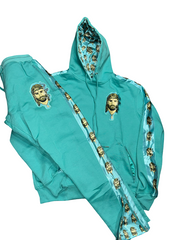 Jogger with satin liner in the hood and accents down the Jogger. leg flares with liner inside zipper. Branded with Jesus Smokes logo.