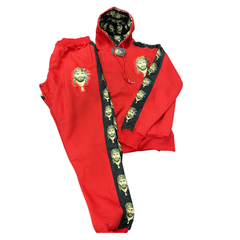 Jogger with satin liner in the hood and accents down the Jogger. leg flares with liner inside zipper. Branded with Jesus Smokes logo.